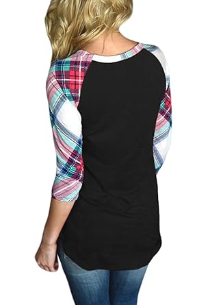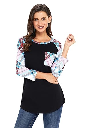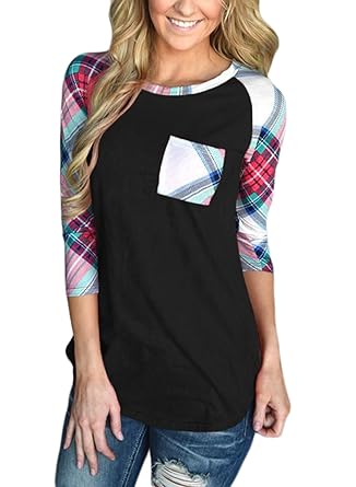 Annflat Women's Casual Striped 3/4 Sleeve Pocket T Shirt Color Block Blouses and Tops S-XXL