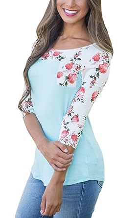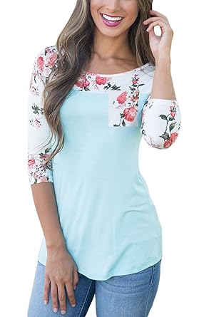 Annflat Women's Floral Print Crew Neck 3 4 Sleeve T-Shirt Casual Pocket Blouse Tops