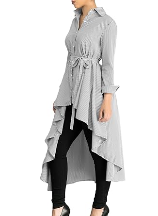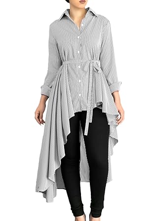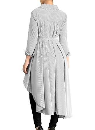Annflat Women's Striped Lapel Long Sleeve Shirt High Low Belted Blouse Tops